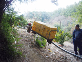 こんなトロッコを使い、山のミカンを収穫します!